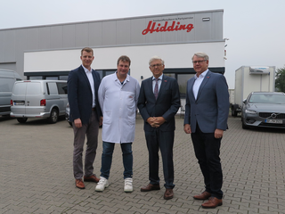 Für eine Politik des Vertrauens und mehr Wertschätzung für Handwerksberufe sprachen sich bei einem Besuch der Feinkostfleischerei Hidding HWK-Präsident Hans Hund und Hauptgeschäftsführer Thomas Banasiewicz gegenüber dem Landtagsabgeordneten Henning Höne und Geschäftsführer Thomas Hidding aus. „Es ist wichtig, dass Lehrkräfte über die Perspektiven im Handwerk Bescheid wissen“, betonte Hans Hund. Sie seien es, die häufig bei der Berufswahlentscheidung beraten, ohne die Berufswelt während ihrer eigenen Ausbildung genügend kennengelernt zu haben. Henning Höne sprach sich für ein Pflichtpraktikum für Lehrkräfte aus und ergänzte: „Im Grundansatz brauchen wir mehr Vertrauen, auch in den gesunden Menschenverstand“. Alle Beteiligten waren sich einig, dass dieser Grundansatz viele bürokratische Hürden abbauen kann.